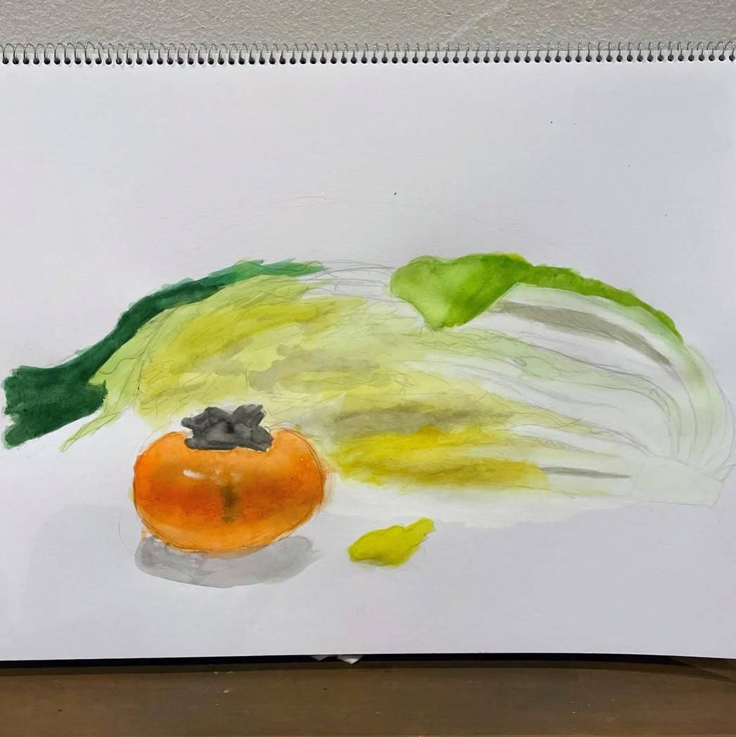 小学2年〜6年生が白菜と旬の果物の柿をよく見て水彩絵の具で着色しました。