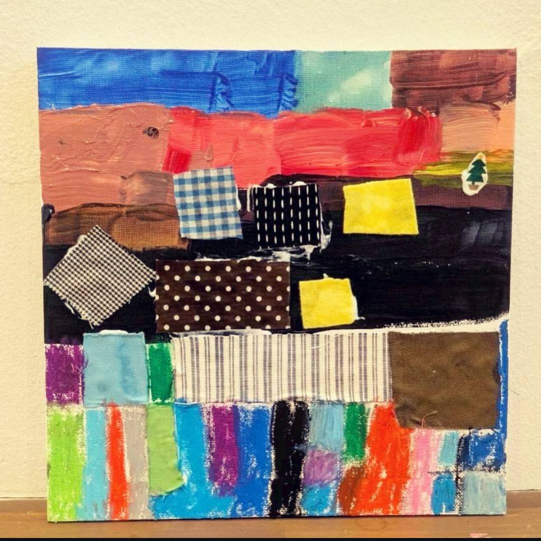アクリル絵の具と布のハギレを使ってコラージュ作品を作りました。
