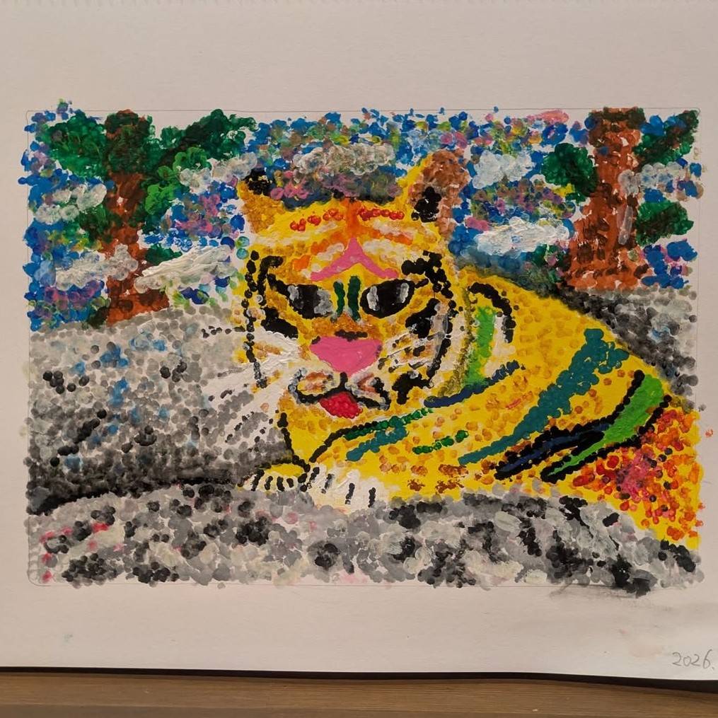 点の配置により混色をしたり陰影や奥行き感を表現する点描画。