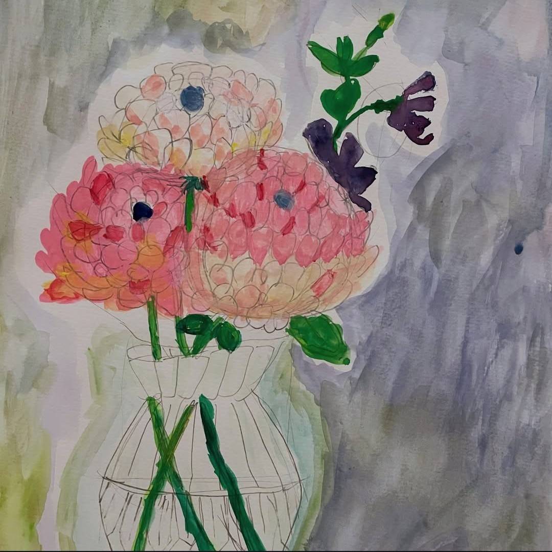 色とりどりのお花をよく観察し、デッサン&水彩絵の具で描きました。