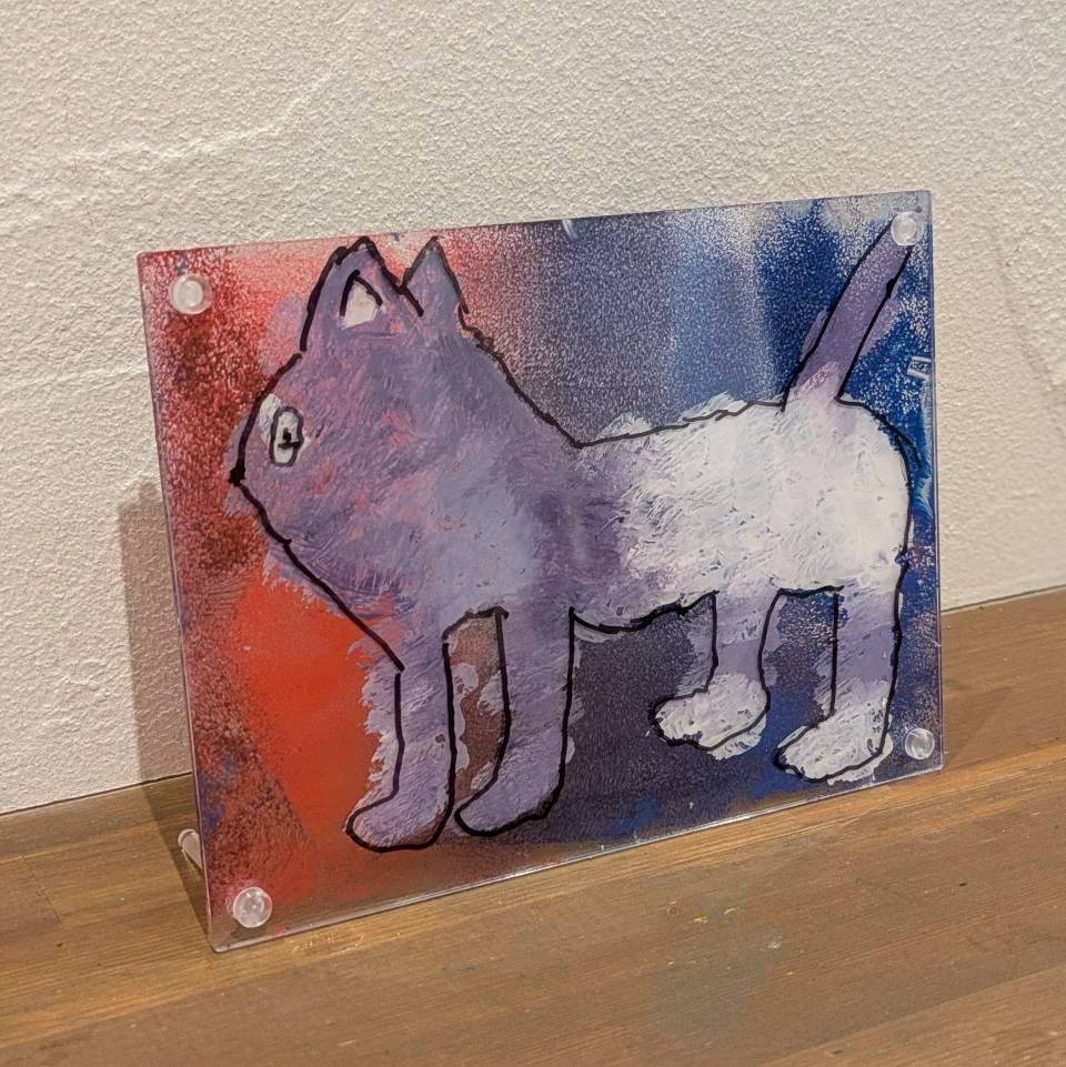 透明でツルツルしたプラスチック板にアクリル絵の具、または水彩絵の具にボンドを...続きを読む