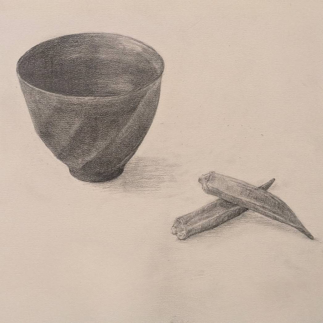 普段何気なく見ていたり食したりしているものをこの機会にモノ自体の色や形状、質感などを描く前に手に取り、