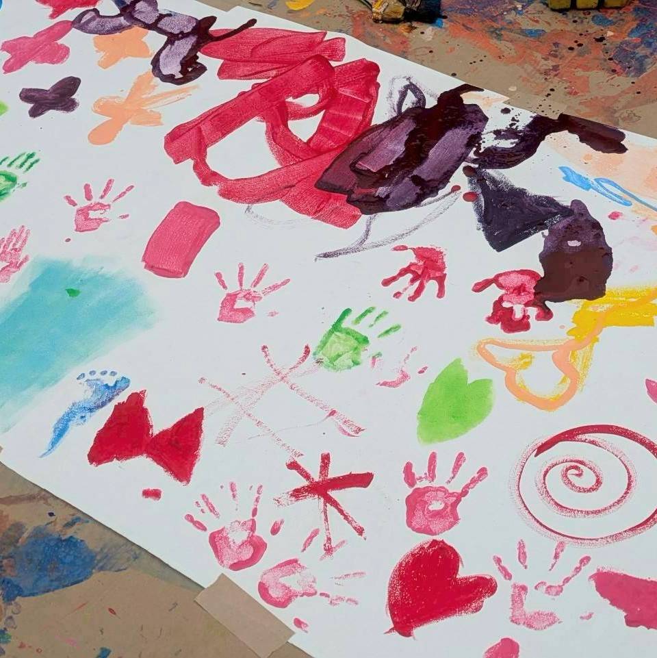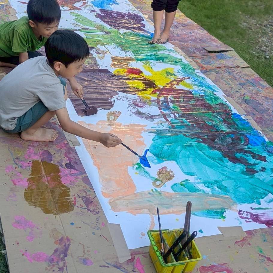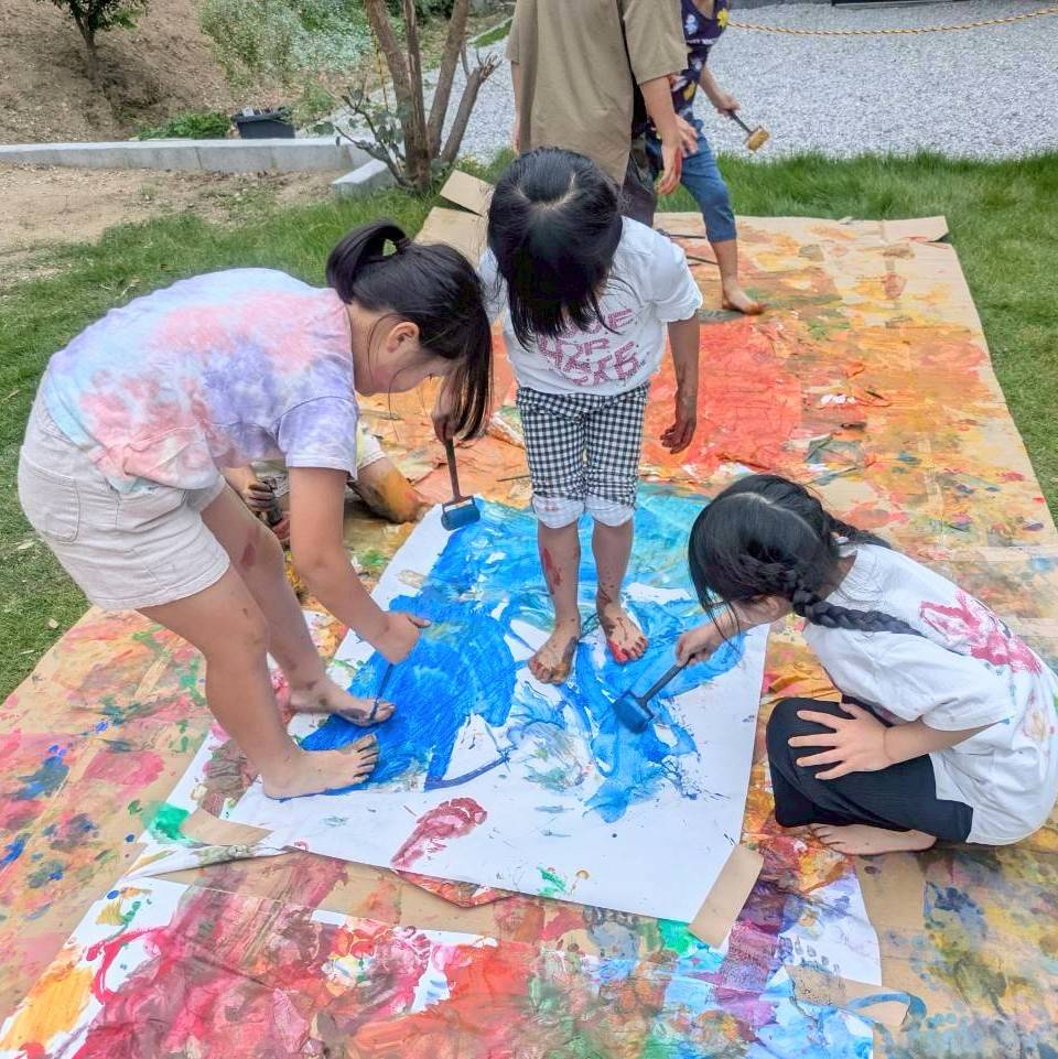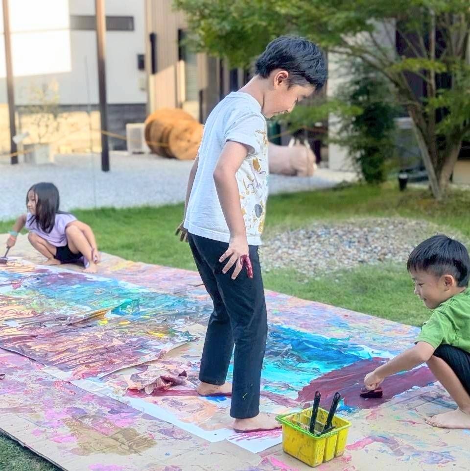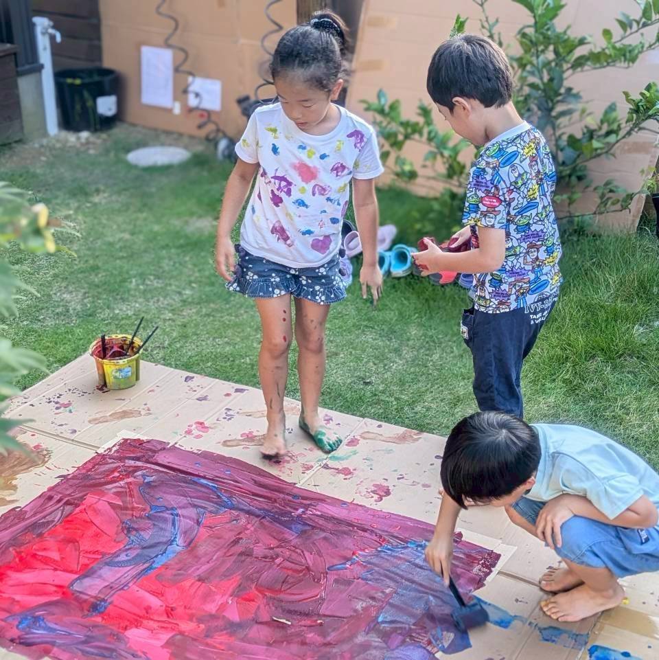 やっと涼しくなった10月、庭で皆んなの大好きな塗りたくりをしました! はじめは恐る恐る筆を持って描いていても大きな紙はあっという間に絵の具だらけに。 すぐに描くところがなくなり、紙を変えたり絵の具を補充したり大忙し。 手も足もカラフルになって早いハロウィンがやってきたかのようで、皆すっごく楽しそうでした~!