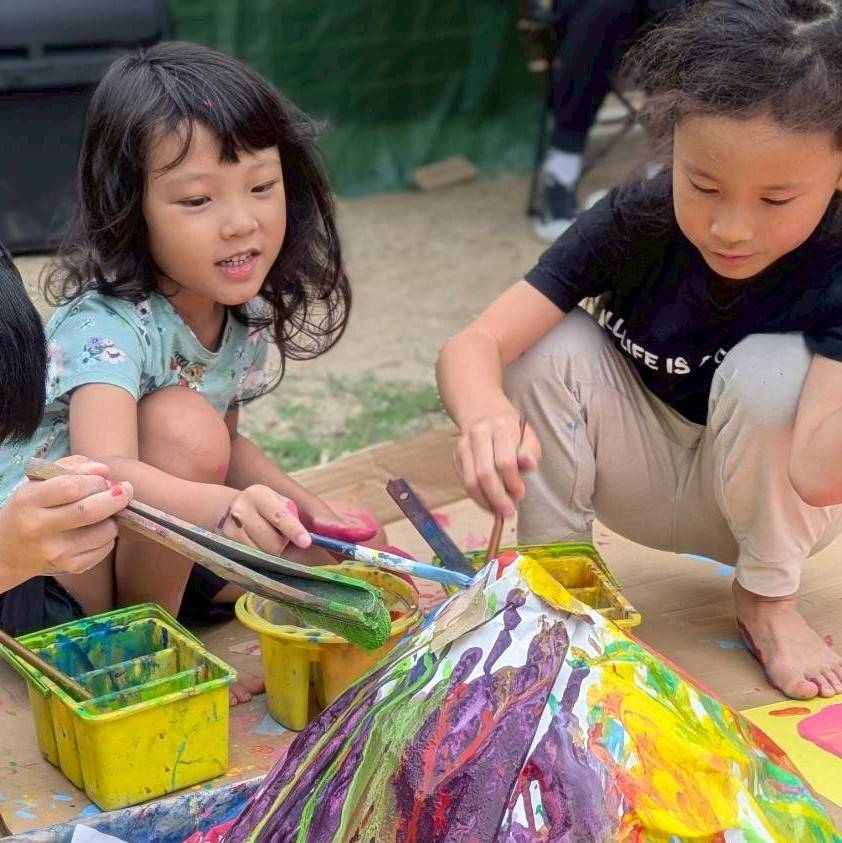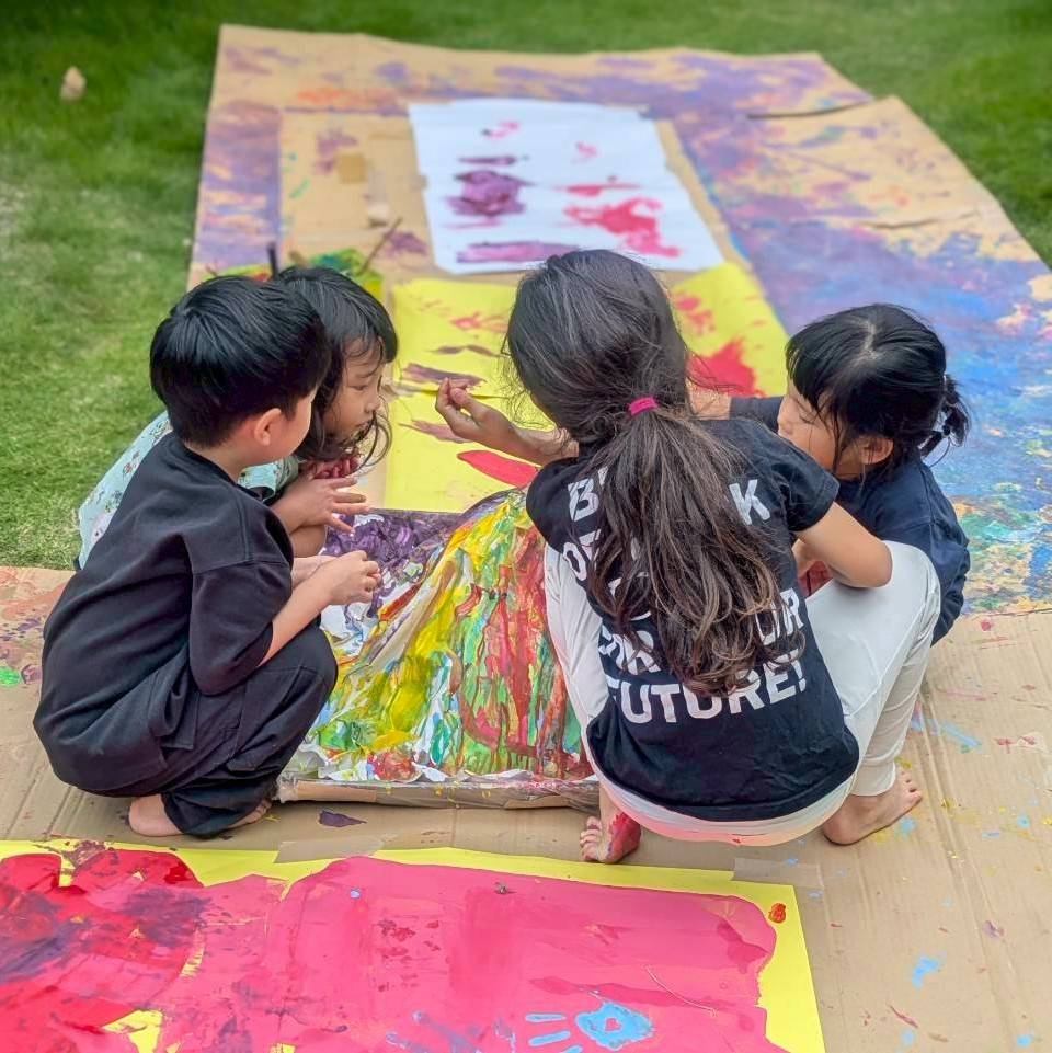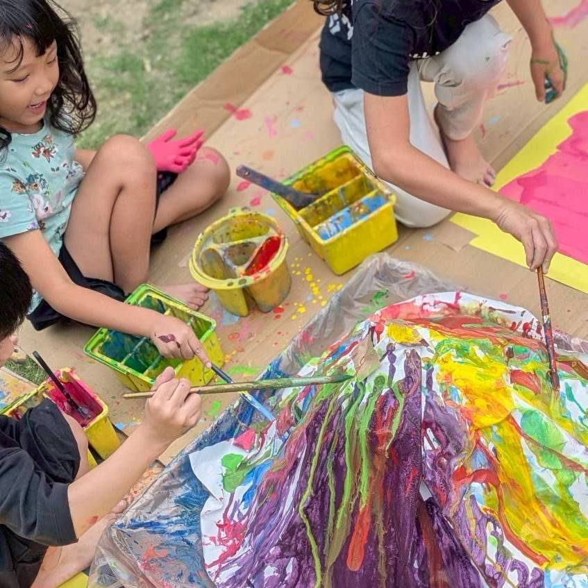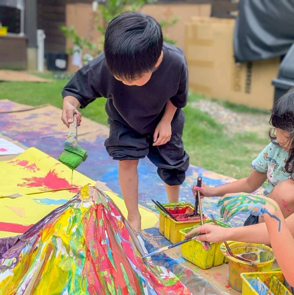 庭で塗りたくりしてからクラスの皆んなで火山に色付け。