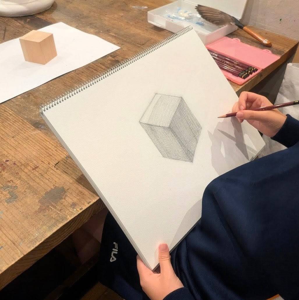 中学2年生 美術系高校を視野に入れているTさんがご入会いただき、 初めて講座にて基礎の1つである木の立方体デッサンを行いました。 立方体は簡単なように見えますが、みな苦労する形状です。初めてでこれだけ描ければどんどん上達しそうで楽しみです。 doodleでは上手いよりワクワクをメインと考えておりますが、受験を見据える場合は指導内容も受験対策に変わります。 少しづつ一緒に頑張って行きましょう〜