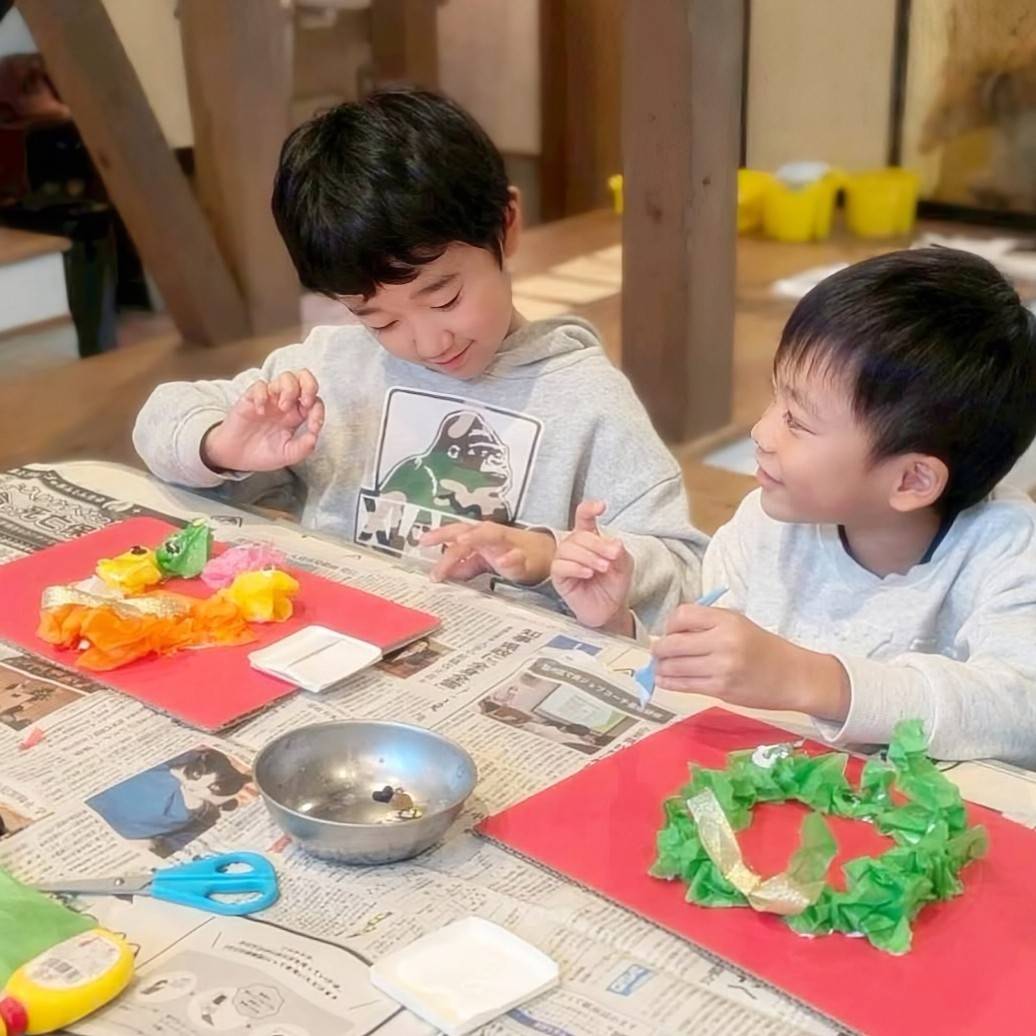 先週は裏表紙、今週は表の表紙にリースを作るところから。キラキラやリボンで飾りつけ。
