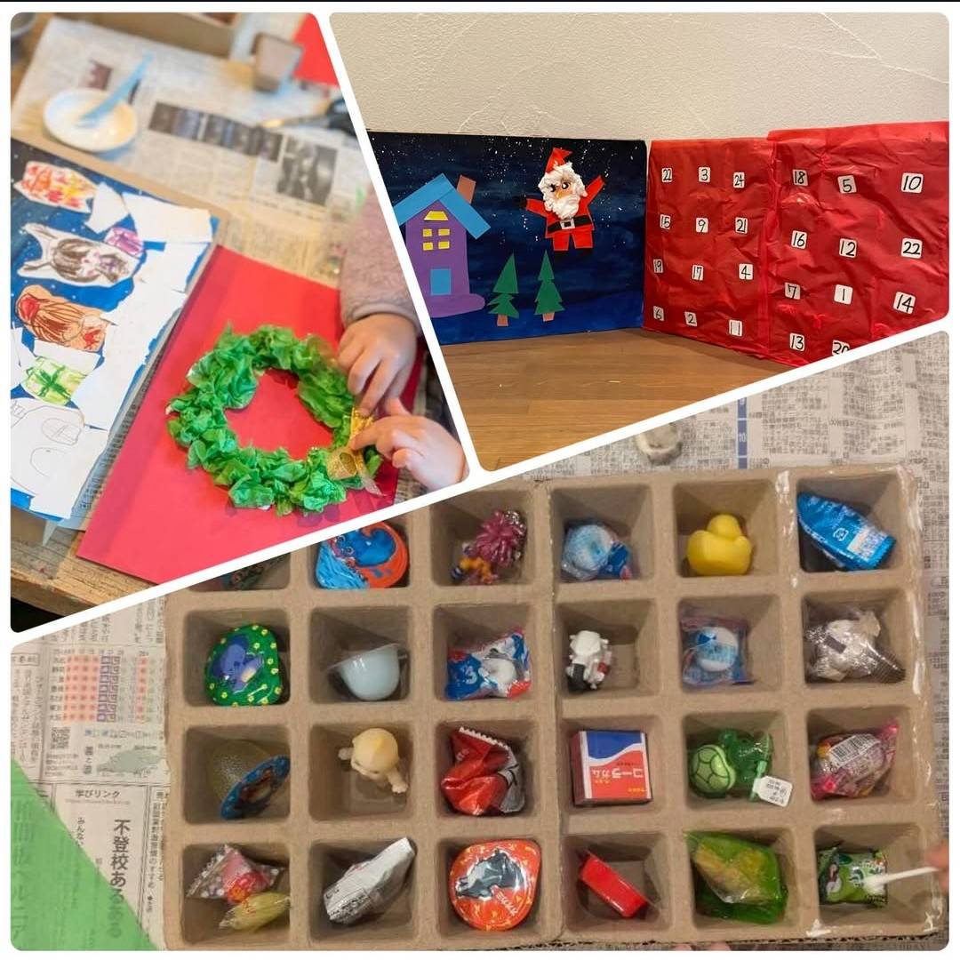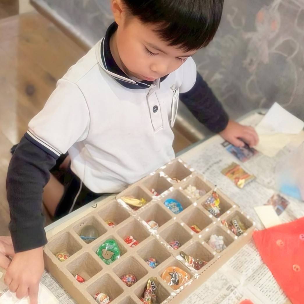 お菓子を詰めてシールに数字を書いて貼って蓋の表裏に作ったリースの紙とクリスマスの絵を貼り、組み立てたら出来上がり。