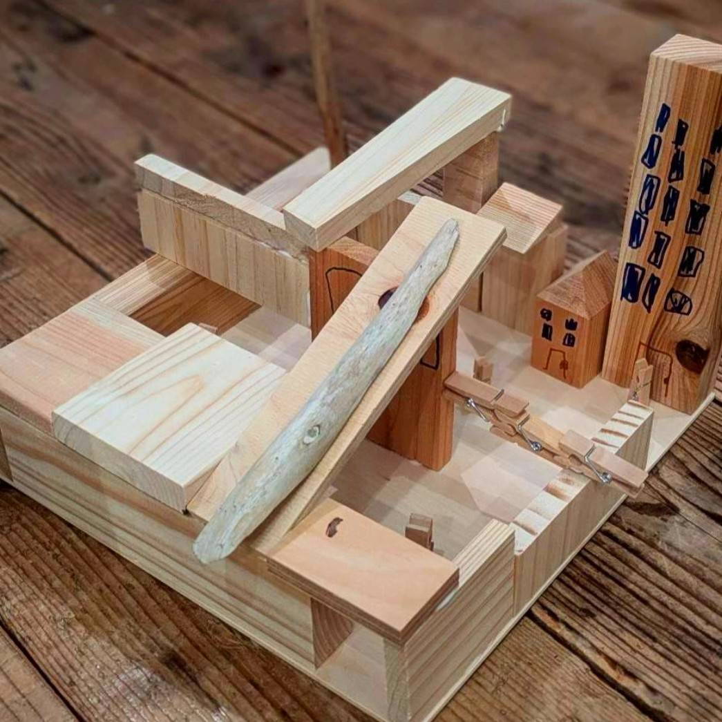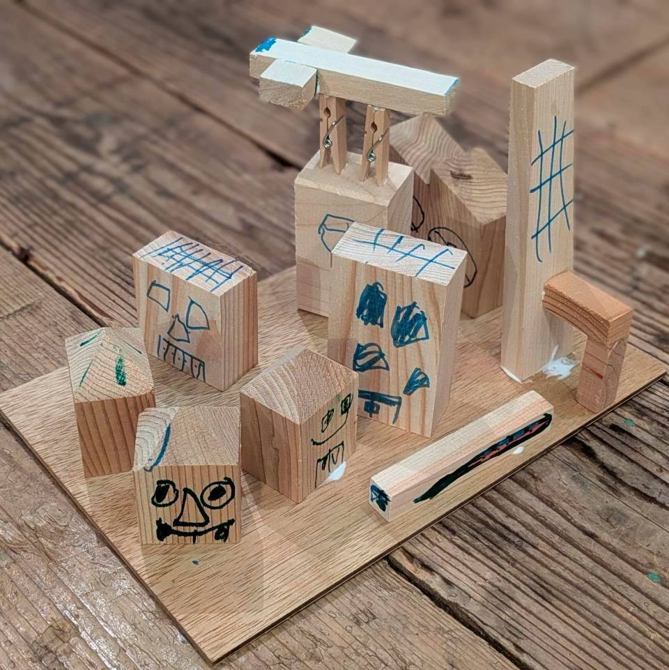 たくさんの木っ端や板を準備して自由に組み合わせて作品を作りました。