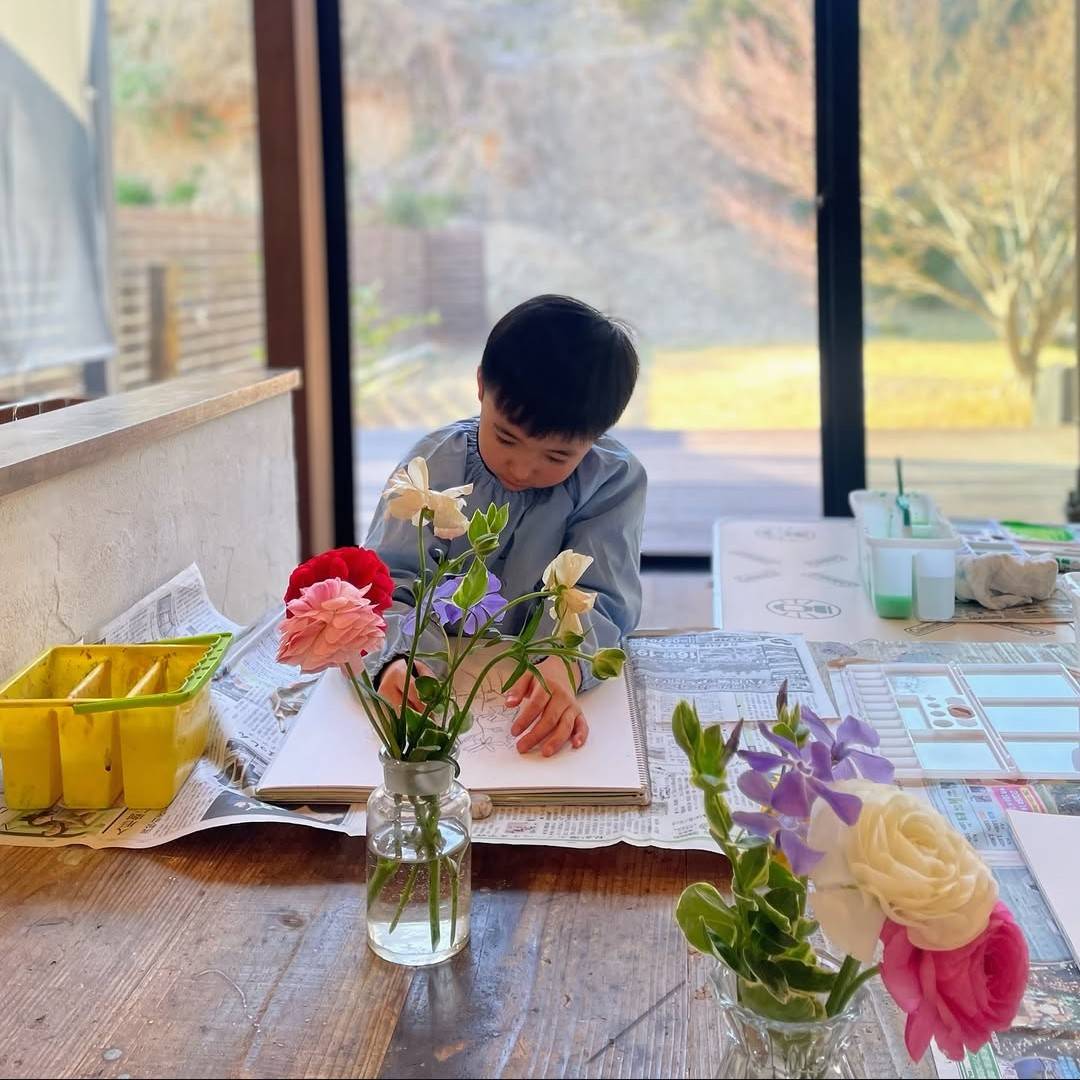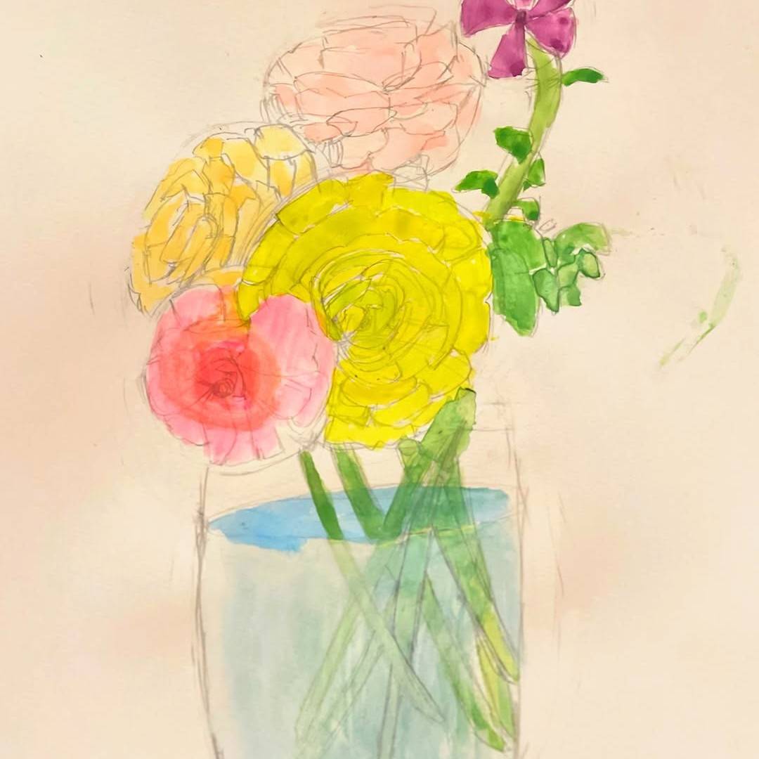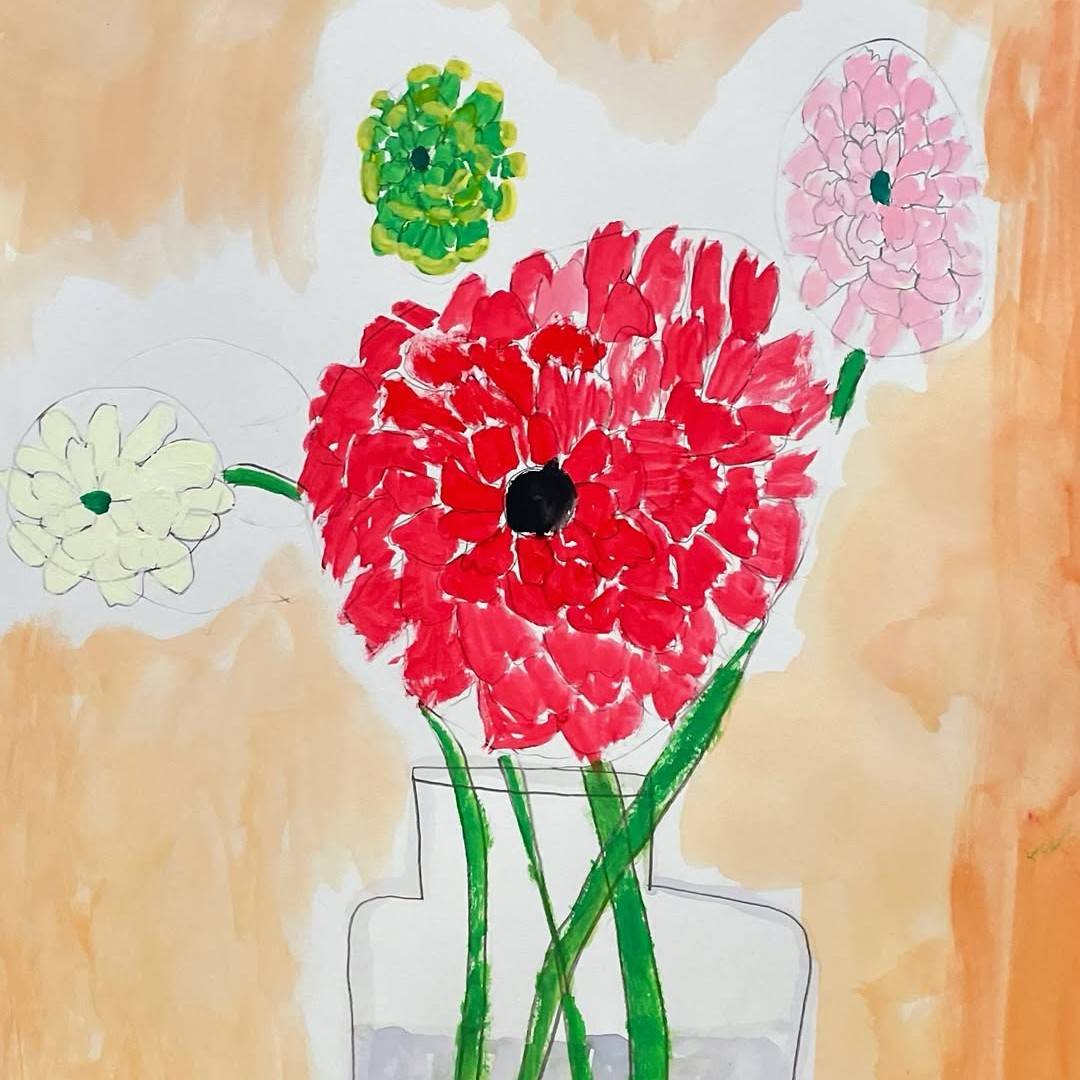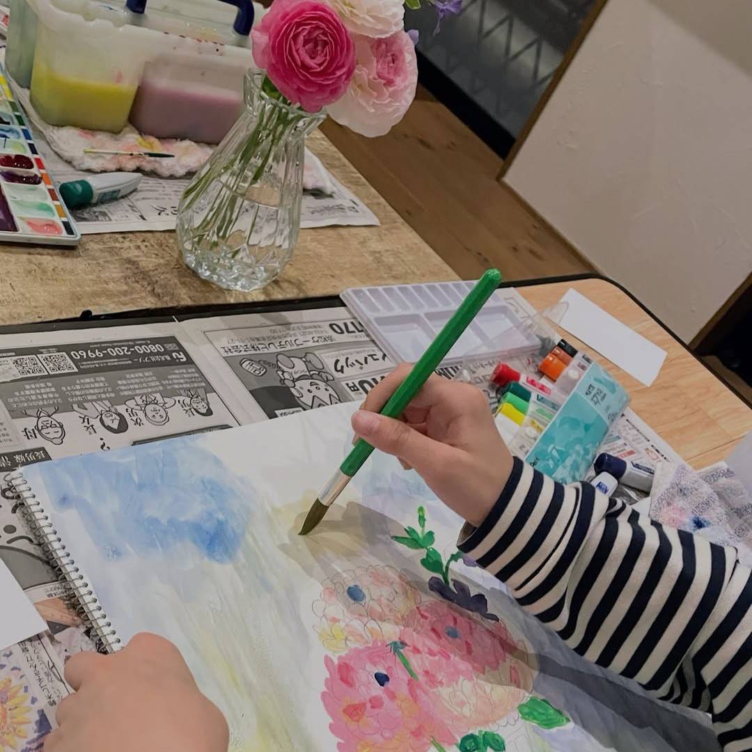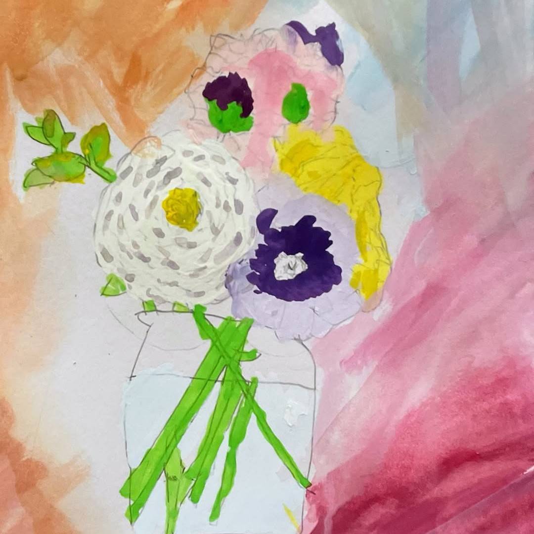 色とりどりのお花をよく観察して水彩絵の具で描きました。 触ったり間近で見て、ちょっとヒンヤリした冷たさや薄い花びらを感じます。 花瓶、水、お花、透明感があるものが多い題材。 水彩絵の具は水分調整が大切です。 透明感は水分多めだと表現できやすくなります。 とはいえ難しいことはほどほどに、特に小さな人には自由に楽しく描いてもらいました。 「難しい」と言いながらも皆んな集中し、画用紙の上に綺麗なお花を咲かせてくれました。